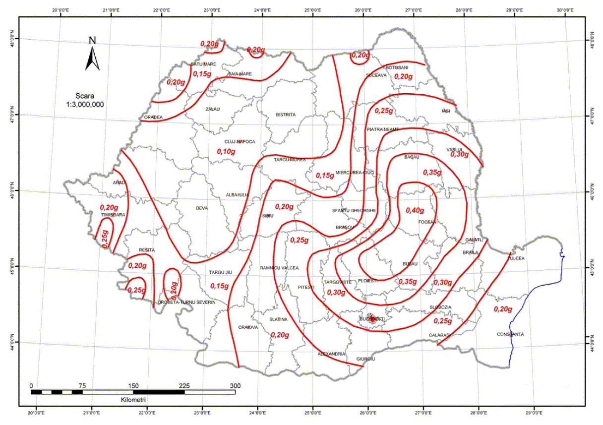 “Valoarea de vârf a acceleraţiei orizontale a mişcării terenului, ag, numită acceleraţia terenului pentru proiectare, corespunde unui interval mediu de recurenţă IMR = 225 ani (ceea ce corespunde unui eveniment seismic a cărui magnitudine are o probabilitate de depăşire de 20% în 50 de ani)”.